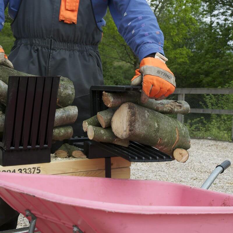 Multiple logs can be cut at the same time and the patented tipping cups mean you don’t have to pick up the logs from the floor – you can tip them straight into your container, such as a wheelbarrow, log bags, trailer or tractor bucket. This innovative new log sawhorse saves time, saves effort, is kinder on your back and safer.